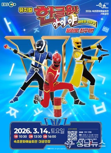 (성남뉴스) 속초시는 3월 14일 10시 30분, 13시 30분, 16시 하루 3회 속초문화예술회관에서 뮤지컬‘한글용사 아이야 새로운 이야기-달라도 친구야’를 선보인다.