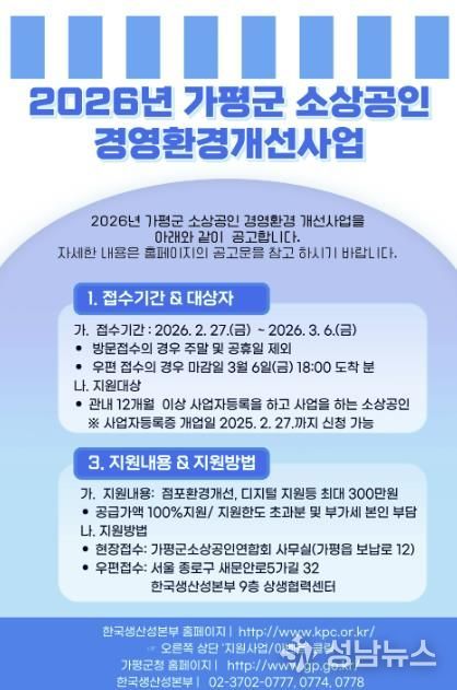 (성남뉴스) 가평군은 관내 소상공인의 지속경영 기반을 강화하기 위해 ‘2026년 가평군 소상공인 경영환경개선사업’ 대상자를 3월 6일까지 모집한다고 밝혔다.