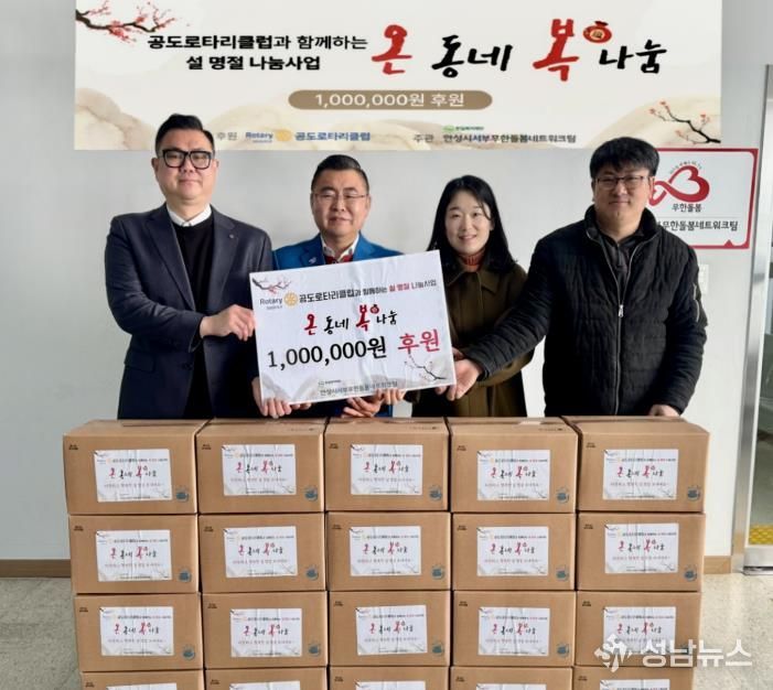 (성남뉴스) 사회복지법인 한길복지재단이 수탁 운영하는 안성시서부무한돌봄네트워크팀은 국제로타리 3600지구 공도로타리클럽과 지난 12일 설 명절 나눔사업 ‘온동네 복나눔’ 후원금 100만 원 전달식을 가졌다.