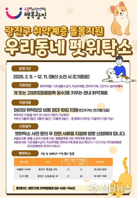 (성남뉴스) 광진구가 갑작스러운 상황으로 인해 반려동물 임시보호가 필요한 취약계층을 위해 ‘우리동네 펫위탁소’를 운영한다.