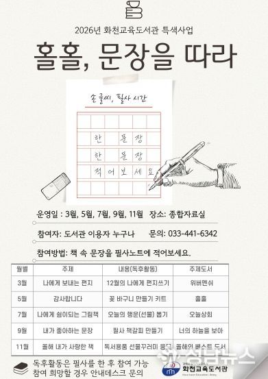 (성남뉴스) 화천교육도서관은 오는 3월부터 11월까지 깊이 있는 독서문화의 확산을 위해 2026년 특색사업 ‘홀홀, 문장을 따라’를 운영한다.