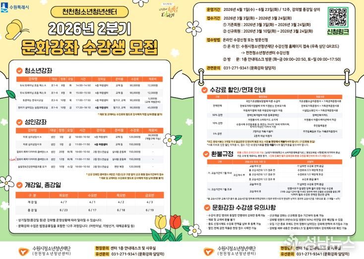 2분기 문화강좌 수강 신청은 선착순으로 진행된다. 기존 수강회원은 3월 3일부터 24일까지, 신규 회원은 3월 10일부터 24일까지 접수 가능하다. 신청 방법은 수원시청소년청년재단 수강신청 홈페이지를 통한 온라인 접수 또는 천천청소년청년센터 1층 안내데스크 방문을 통해 가능하다.