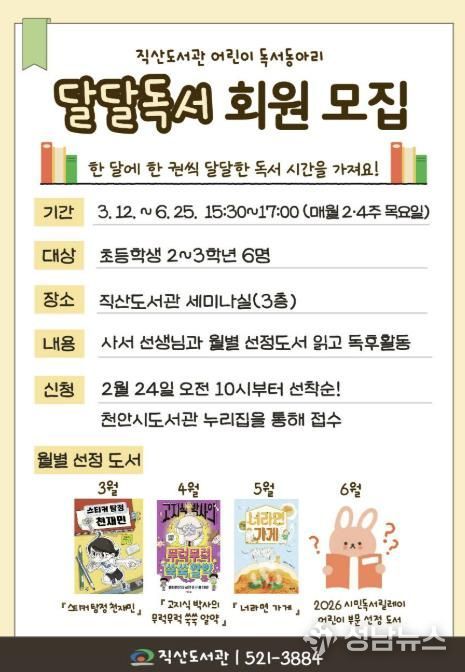 (성남뉴스) 천안시 직산도서관은 상반기 어린이 독서동아리 ‘달달독서’ 참여자를 모집한다고 23일 밝혔다.