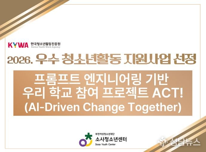 (성남뉴스) 부천여성청소년재단이 운영하는 소사청소년센터는 한국청소년활동진흥원이 주관하는 ‘2026년 우수 청소년활동 프로그램 지원사업’ AI·디지털 분야에 선정됐다고 밝혔다.