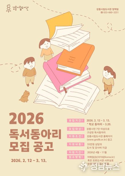 (성남뉴스) 강릉시립도서관은 지역 내 독서 문화 활성화와 시민 간 문화 교류 증진을 위해 '2026년도 독서동아리 지원사업'을 운영한다.