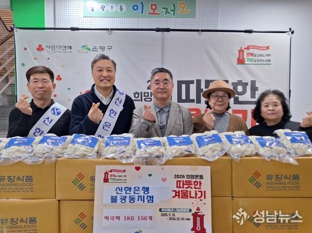(성남뉴스) 서울 은평구 불광1동은 지난 12일 신한은행 불광동지점으로부터 관내 취약계층 지원을 위한 떡국떡 156kg을 기부받았다고 밝혔다.