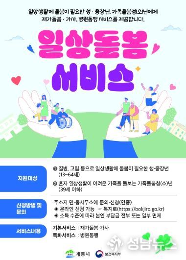 (성남뉴스) 충남 계룡시가 질병, 고립 등으로 일상 생활에 어려움을 겪는 시민들을 위해 ‘2026년 일상돌봄 서비스’ 이용자를 모집한다고 밝혔다.