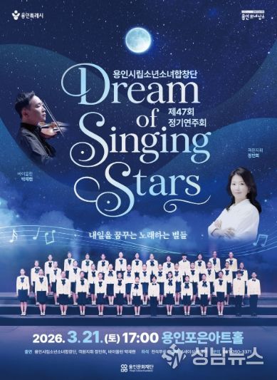 (성남뉴스) 용인문화재단은 오는 3월 21일 용인포은아트홀에서 용인시립소년소녀합창단 제47회 정기연주회'Dream of Singing Stars'를 개최한다고 밝혔다.