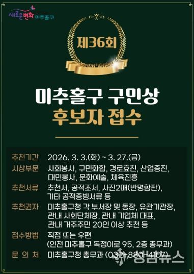 추천 서류는 미추홀구청 총무과로 직접 방문하거나 우편(미추홀구 독정이로 95, 미추홀구청 총무과)을 통해 접수할 수 있으며, 수상자는 미추홀구 구민상심의위원회의 심의를 거쳐 최종 결정된다. 시상은 5월 1일 제36회 구민의 날 기념식에서 진행될 예정이다.