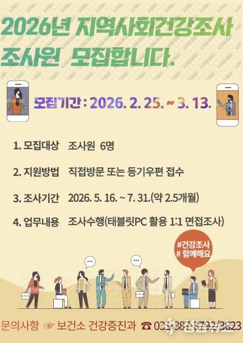 (성남뉴스) 여주시보건소 건강증진과는 질병관리청, 한양대학교와 함께 공동으로 실시하는 지역사회건강조사를 수행할 조사원을 2월 25일부터 3월 13일까지 모집한다고 밝혔다.