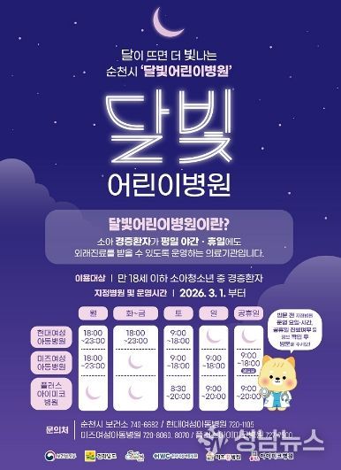 (성남뉴스) 순천시는 의료 인력 부족과 심야 진료 부담 속에서도 지역 내 소아 의료공백이 발생하지 않도록 3개 달빛어린이병원을 운영하며 주 7일, 야간·휴일에도 의료공백 없는 진료체계를 유지하고 있다.