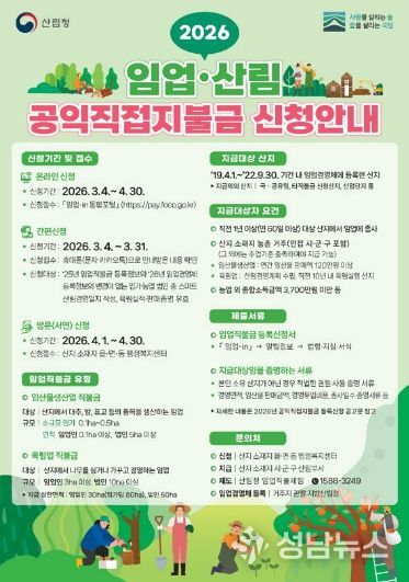 (성남뉴스) 순천시는 2026년 임업‧산림 공익직접지불금 신청접수를 오는 3월 4일부터 4월 30일까지 실시한다고 밝혔다.