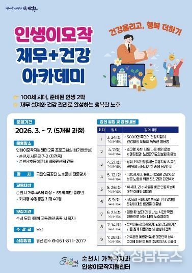 (성남뉴스) 순천시는 중·장년층의 삶의 설계와 안정적인 노후 준비를 돕기 위해 ‘재무·건강 아카데미’ 수강생을 3월부터 7월까지 수시 모집한다고 밝혔다.