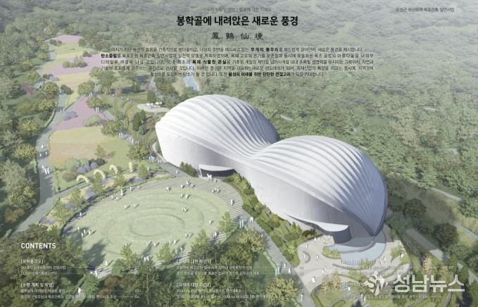 군에 따르면, 이번 설계 공모에는 총 3개의 작품이 접수됐다. 군은 지난달 26일에 열린 건축·목구조·조경전문가 7인으로 구성된 심사위원회에서 봉학골 정원의 지형과 경관을 살린 배치 계획 등을 종합 평가해 ㈜선엔지니어링 종합건축사사무소 작품을 당선작으로 선정했다.