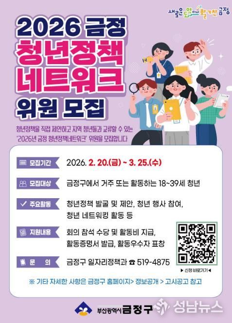 (성남뉴스) 부산 금정구는 2월 20일부터 3월 25일까지 2026 금정 청년정책네트워크 위원을 모집한다.