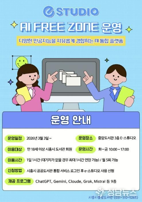(성남뉴스) 시흥시중앙도서관은 시민들의 인공지능(AI) 활용 역량 강화를 위해 시 정보통신과와 협업해 도서관 3층 e-스튜디오에 ‘인공지능(AI) 프리 존(Free Zone)’을 구축하고, 오는 3월 3일부터 본격 운영에 들어간다.
