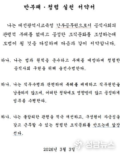 (성남뉴스) 대전시교육청은 3월 3일, 시교육청 6층 중회의실에서 고위직 공무원을 대상으로 투명하고 공정한 조직문화 조성을 위한 ‘청렴 실천 서약’을 실시했다고 밝혔다.