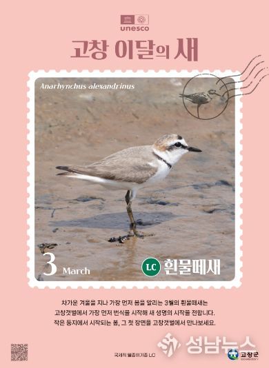 (성남뉴스) 고창군이 3월 ‘고창갯벌 이달의 새’로 흰물떼새(학명 Anarhynchus alexandrinus)를 선정하고, 봄철 갯벌 번식 조류 보호와 생태계 보전의 중요성을 알리는 홍보 활동을 추진한다.