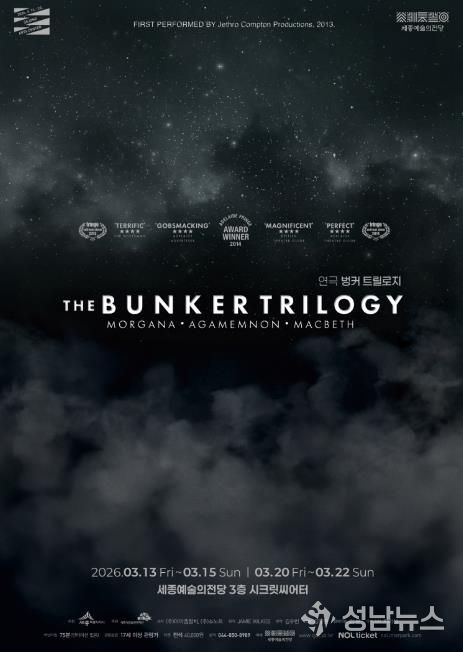 (성남뉴스) 세종예술의전당은 오는 3월 13일부터 22일까지 약 2주간, 시크릿씨어터에서 2026년 기획공연 연극 ‘벙커 트릴로지’를 선보인다. 이번 공연은 수도권 외 지역에서는 처음으로 진행되는 지방 초연이자, 세종예술의전당의 가변형 공간인 시크릿씨어터에서 시도되는 첫 연극이라는 점에서 큰 기대를 모으고 있다. 티켓 오픈 직후 좌석이 빠르게 소진되며 모든 회차 매진을 눈앞에 두고 있다.