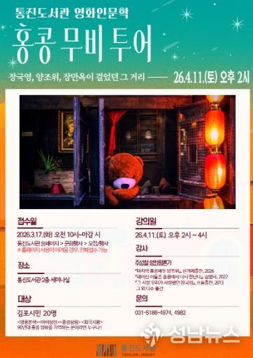 (성남뉴스) 김포시 통진도서관은 90년대 홍콩영화 속 장소와 인물에 대한 영화 인문학 프로그램 ‘홍콩 무비 투어’를 4월 11일 오후 2시부터 통진도서관 세미나실에서 운영한다.