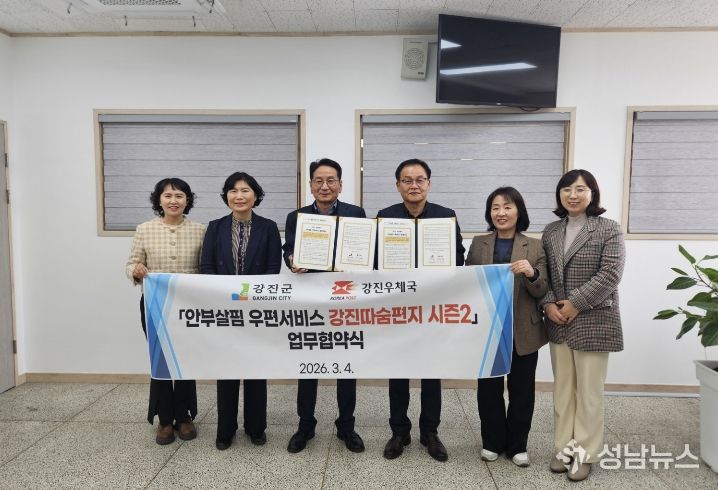 (성남뉴스) 강진군이 작년에 이어 올해에도 행정안전부 공모사업 ‘2026년 읍면동 스마트 복지‧안전서비스 개선 모델 개발 지원사업’의 ‘안부살핌 우편서비스’ 부문에 선정돼 국비 1천만 원과 우체국공익재단 8백만 원을 포함한 총 2천 8백만 원 규모의 예산을 투입해 촘촘한 복지 안전망 구축에 나섰다.