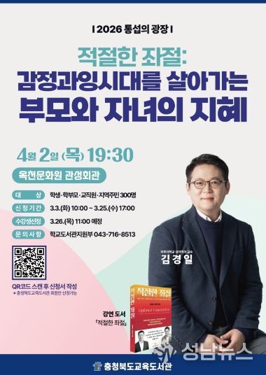 (성남뉴스) 충청북도교육도서관(관장 노재경)이 주최하는 프리미엄 인문 강연 '통섭의 광장'이 오는 4월 2일 옥천문화원 관성회관에서 열린다.