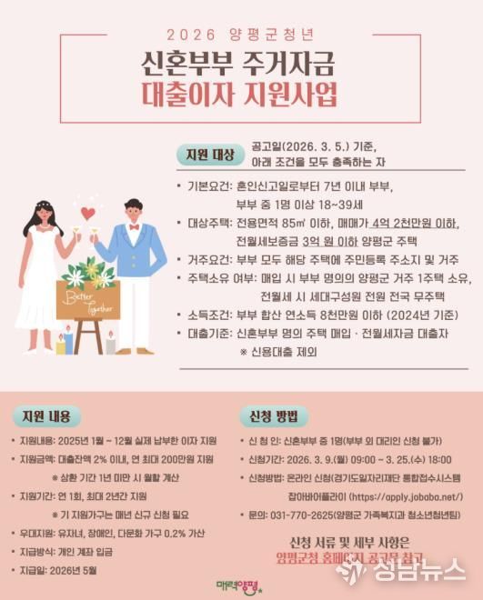(성남뉴스) 양평군은 주택 매입 또는 임차(전월세) 자금 대출을 받은 양평군 거주 청년 신혼부부를 대상으로 연간 최대 200만 원의 대출이자를 지원하는 ‘2026년 양평군 청년 신혼부부 주거자금 대출이자 지원 사업’을 시행한다고 5일 밝혔다.