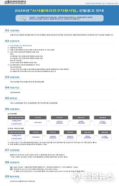 (성남뉴스) 서울미래인재재단은 AI 연구 분야 이공계 전공 석·박사 재학생과 박사후 연구원 총 255명을 선발해 76억 원 규모의 연구지원금을 지원하는 ‘AI서울테크연구지원사업’을 새롭게 추진한다. 이를 통해 AI 분야 우수 인재들이 안정적인 환경에서 연구에 전념할 수 있도록 지원할 계획이다.
