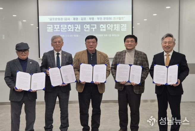 (성남뉴스) 부천문화원과 강서문화원, 계양문화원, 김포문화원, 부평문화원은 3월 4일 부천문화원에서 ‘굴포문화권’을 토대로 하는 연구교류 협약식을 체결했다. 이로써 ‘굴포’를 같은 문화권으로 하는 부천문화원·강서문화원·계양문화원·김포문화원·부평문화원은 학술대회와 콘텐츠 발굴 사업 등 다양한 지역학 자원을 발굴하고 활성화하기 위해 최초로 지역학 연구 모델을 구축하게 됐다. 특히, 이번 협약은 경기도(부천, 김포), 서울특별시(강서), 인천광역시(계양, 부평)를 잇는 ‘지역학’ 중심의 연구 교류를 마련한다는 점에서 주목된다.