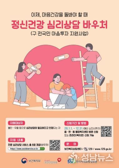 (성남뉴스) 부산 사하구는 우울, 불안 등 정서적 어려움을 겪는 구민을 대상으로 대화 기반의 전문 심리상담 서비스를 제공하는 ‘정신건강 심리상담 바우처사업(구 전 국민 마음투자 지원사업)’을 시행한다고 밝혔다. 이 사업은 자살 예방과 정신질환의 사전 예방을 도모하고 구민의 정신건강 증진을 돕기 위해 마련된 심리지원 정책이다.