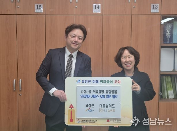 (성남뉴스) 평화 경제 거점 도시 강원 고성군은 3월 5일, 대교뉴이프(대표 김경호)와 ‘고성e음 인지케어 서비스’ 추진을 위한 업무 협약을 체결했다고 밝혔다.