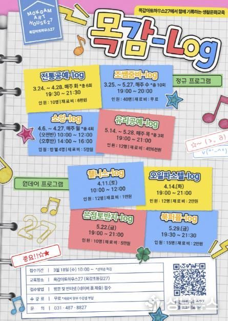 (성남뉴스) 시흥시는 목감아트하우스27에서 운영하는 상반기 생활문화교육 ‘목감-로그(log)’ 참여자를 모집한다.