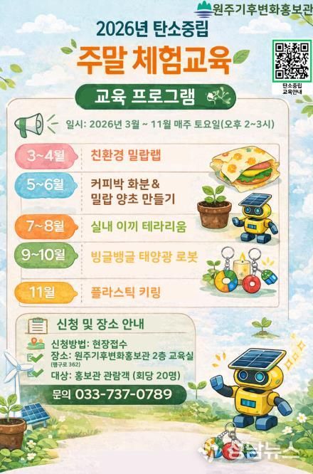 (성남뉴스) 원주기후변화홍보관은 시민들이 생활 속에서 탄소중립을 쉽고 재미있게 이해하고 실천할 수 있도록 ‘탄소중립 주말 체험교육 프로그램’을 운영한다.