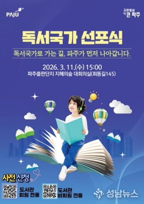 (성남뉴스) 파주시는 오는 11일 15시, 파주출판도시 지혜의숲 대회의실에서 ‘파주시 독서국가 선포식’을 개최하고 책 읽는 도시를 넘어 ‘독서국가’로 나아가기 위한 힘찬 출발을 알린다.