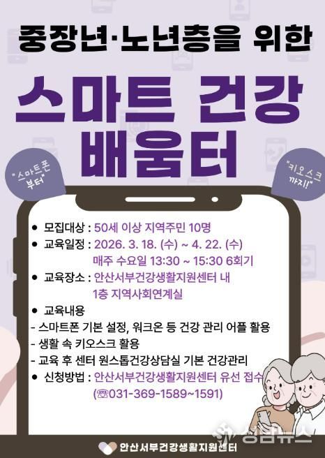 (성남뉴스) 안산시는 단원보건소 서부건강생활지원센터는 오는 18일부터 ‘중장년‧노년층을 위한 스마트 건강 배움터’를 운영한다고 6일 밝혔다.