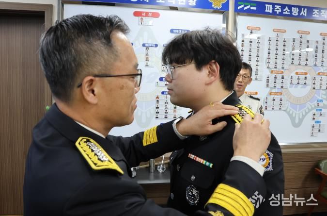 (성남뉴스) 파주소방서는 5일 오전 9시 서장실에서 장기 근무와 성실한 직무 수행으로 근속승진한 소방공무원 8명에 대한 계급장 수여식을 열었다.