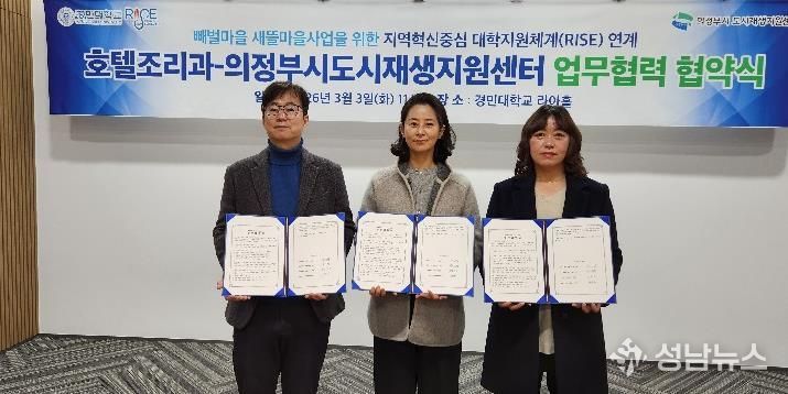 (성남뉴스) 의정부시도시재생지원센터는 3월 3일 경민대학교 호텔조리과와 성공적인 빼벌새뜰마을사업을 위해 업무협약을 체결했다.
