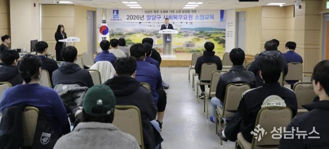(성남뉴스) 수원시 팔달구는 지난 5일 팔달구청 대회의실에서 사회복무요원 전원을 대상으로 2026년 상반기 소양교육을 실시했다.