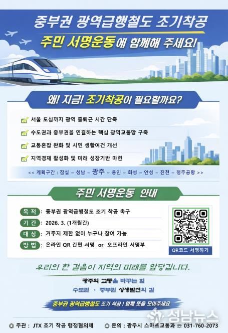 (성남뉴스) 광주시는 중부권 광역급행철도의 조기 착공을 촉구하기 위해 3월 한 달간 주민 서명운동을 한다고 6일 밝혔다.