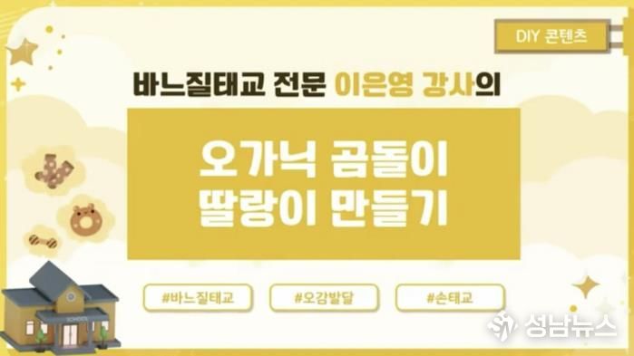 또한 3강은 엄마의 소근육 운동과 함께 아기의 두뇌 발달과 정서적 교감을 돕는 손수 제작(DIY) 손태교 교육으로 진행된다. 양평군보건소는 선착순 40명을 모집해 손수 제작(DIY) 바느질 태교 재료(곰돌이 딸랑이 만들기)를 자택으로 배송할 예정이며, 참여자는 동영상 강의를 보며 2주간 교육을 받을 수 있다.