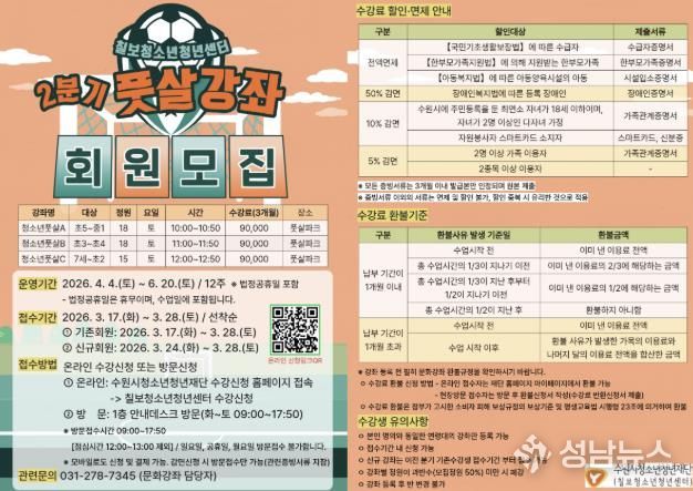 (성남뉴스) 수원시청소년청년재단 칠보청소년청년센터는 지역 청소년들의 건강한 여가 생활과 체력 증진을 위해녪년 2분기 문화강좌(풋살 교실)’수강생을 모집한다고 밝혔다.