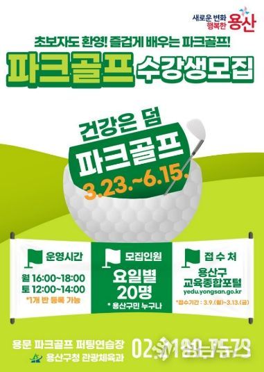 교육은 월요일반(매주 월 16:00~18:00)과 토요일반(매주 토 12:00~14:00) 등 2개 반으로 운영되며, 반별 20명씩 선착순 모집한다. 모집 대상은 용산구 거주자 또는 용산구 생활권자다. 교육은 3월 23일부터 6월 15일까지 주 1회, 총 12회 과정으로 진행되며, 장소는 용문 파크골프 퍼팅연습장(용문동 5-64)이다. 참가비는 무료다.