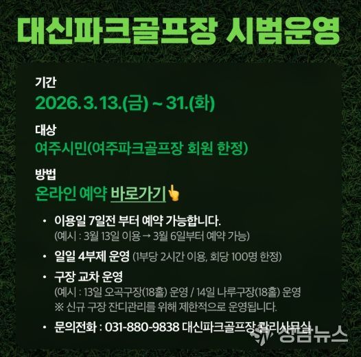 (성남뉴스) 여주도시공사는 남한강의 수려한 경관과 천연잔디의 푸름을 만끽할 수 있는 대신파크골프장의 정식 개장을 앞두고, 오는 3월 13일부터 31일까지 여주시민을 위한 시범운영을 실시한다고 밝혔다.