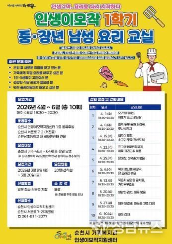 (성남뉴스) 순천시는 중·장년 남성의 건강한 식생활 형성과 활기찬 인생 2막 준비를 지원하기 위해 ‘중·장년 남성 요리교실’ 수강생을 모집한다고 밝혔다.
