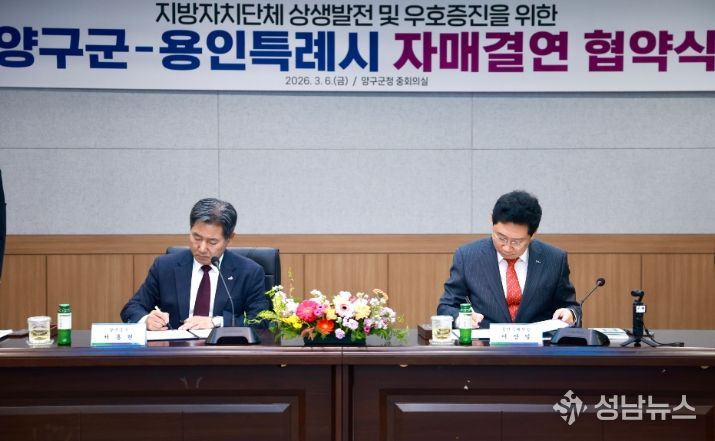 (성남뉴스) 용인특례시는 6일 강원특별자치도 양구군과 자매결연을 하고, 두 도시의 교류와 발전을 위해 적극 협력하기로 했다.