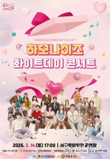 (성남뉴스) 서구문화회관은 3월 14일 오후 7시 서구문화회관 공연장에서 목소리로 세상에 희망과 기쁨을 전하는 대한민국 대표 쇼콰이어그룹 하모나이즈를 초청해'화이트데이 콘서트'를 개최한다.
