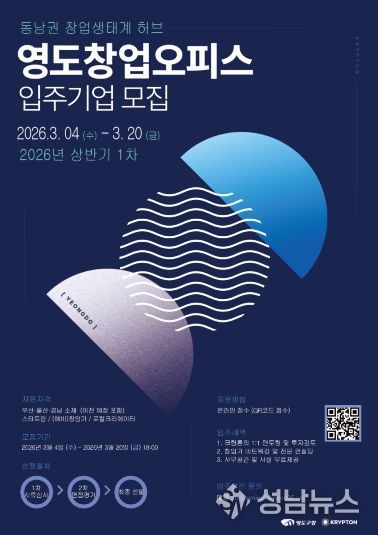 (성남뉴스) 부산 영도구는 지역 내 유망한 예비 창업가를 발굴하고 기존 창업자의 역량을 강화하기 위해 '2026년 영도 창업오피스 입주기업(팀)'을 오는 3월 20일까지 모집한다고 밝혔다.