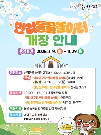 (성남뉴스) 대전 대덕구에 반려동물과 보호자가 함께 이용할 수 있는 놀이터 두 곳이 문을 연다.