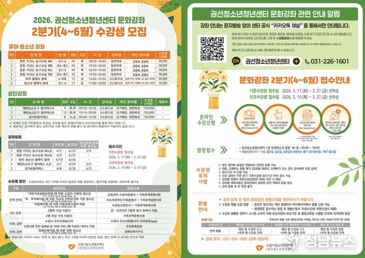 (성남뉴스) 수원시청소년청년재단 권선청소년청년센터는 오는 3월 17일부터 3월 27일까지 지역사회 평생학습 문화강좌 2분기(4~6월) 수강생을 모집한다.