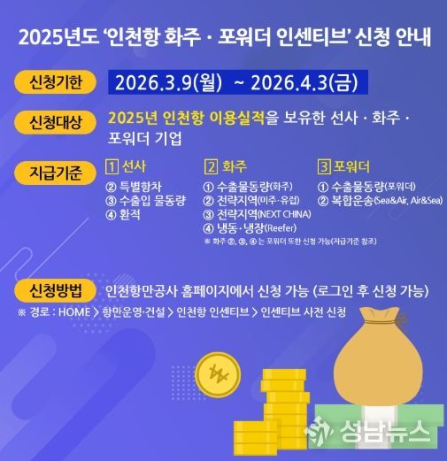 (성남뉴스) 인천항만공사는 지난해 인천항을 이용한 화주와 포워더 기업을 대상으로 이달 9일부터 내달 3일까지 ’25년 인천항 선사·화주·포워더 인센티브’ 지급 신청을 받는다고 9일 밝혔다.
